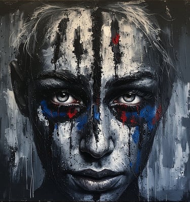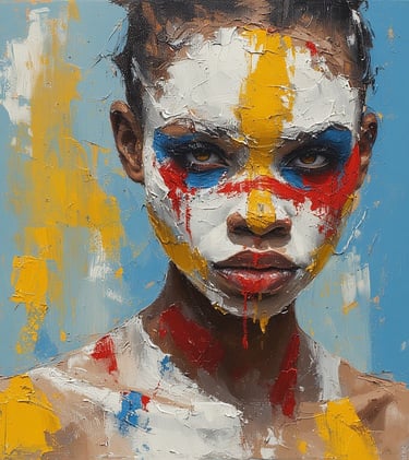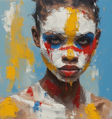 An art gallery features a brightly colored painting on a white wall. The artwork includes a vivid blue face surrounded by dynamic colors and patterns, with smaller figures or elements integrated into the scene.